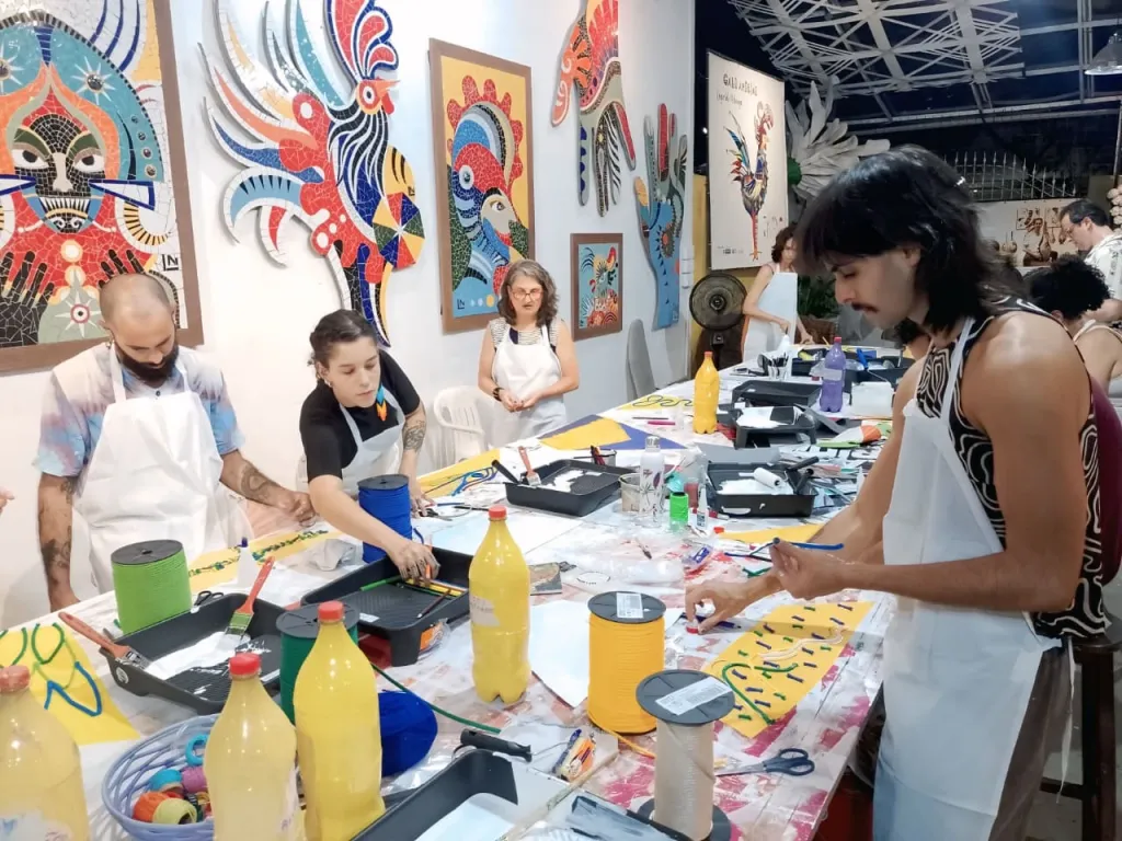 As oficinas de arteterapia, organizadas pela Traços-Estudos em Arteterapia, permitirão que os participantes confeccionem mosaicos de plástico, que serão utilizados no revestimento do traje luxuoso do Galo Gigante. Este trabalho não só promove a terapia por meio da criação artística, mas também reforça a prática de ressignificação de materiais descartados, alinhando-se a conceitos de sustentabilidade e economia circular.